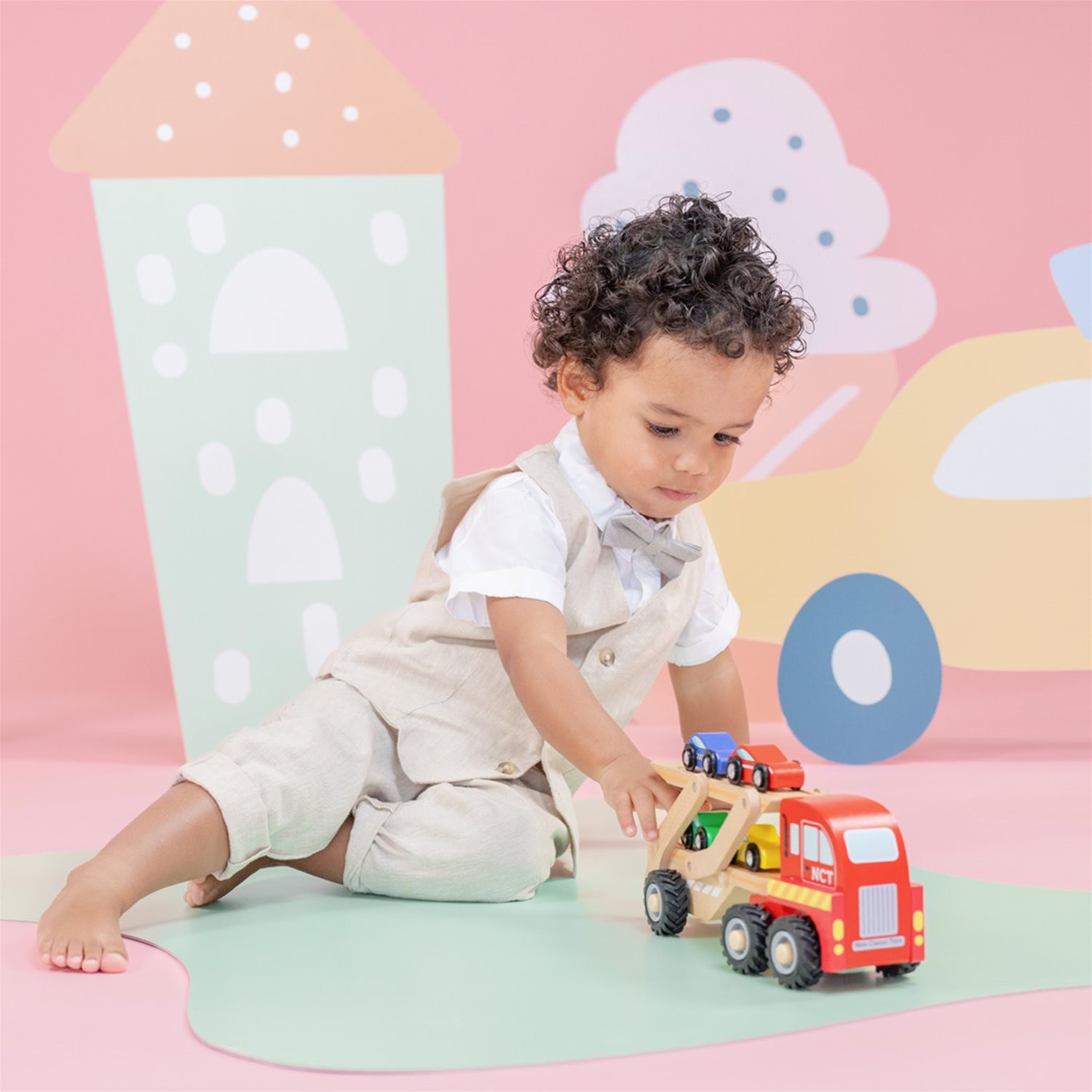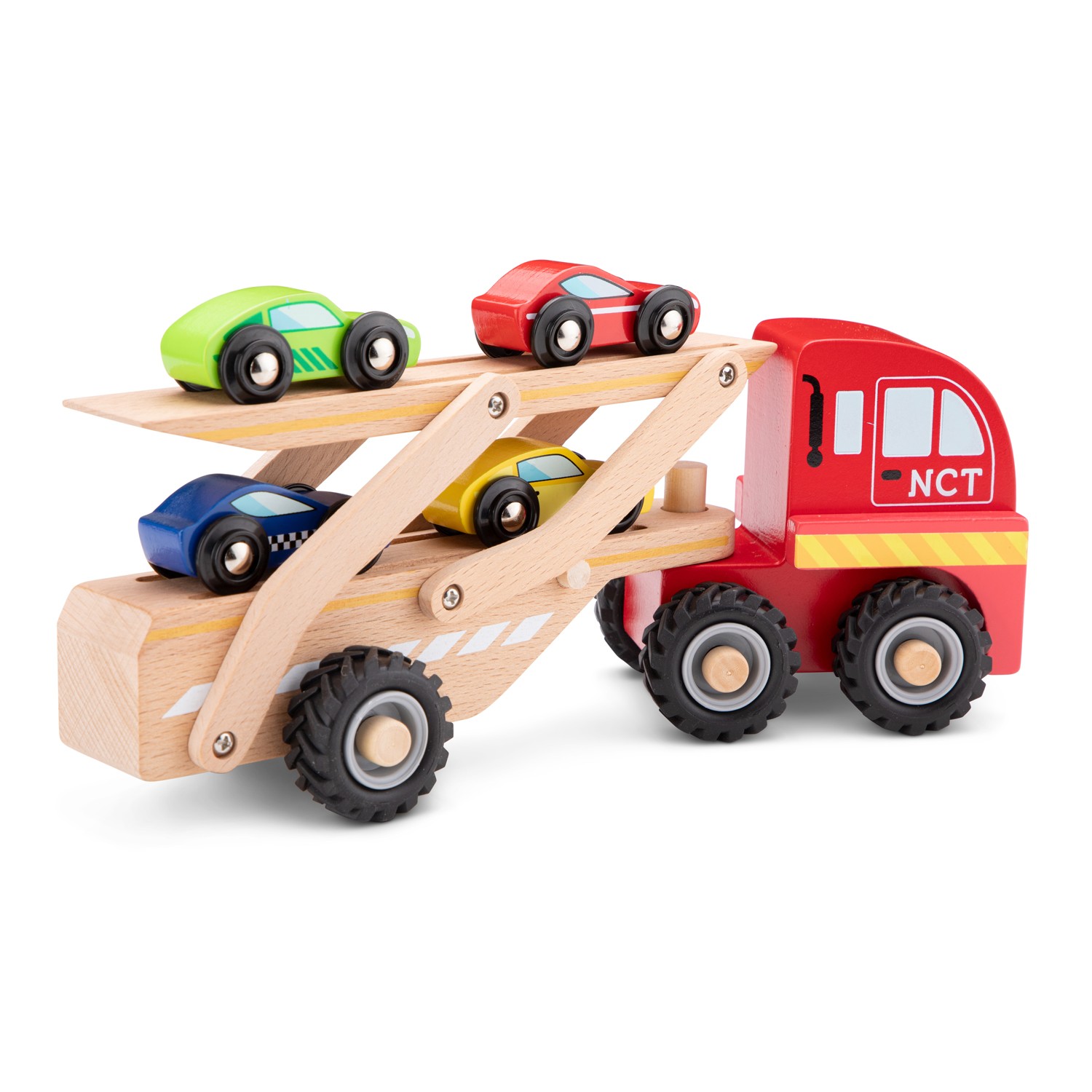 Доставьте свои автомобили по всей стране с этим крепким автомобильным транспортером, сделанным из каучукового дерева. Голландский производитель игрушек предлагает набор из машинок: грузовик перевозчик и 4 маленьких авто. Грузовик имеет 2 уровня для перевозки автомобилей. Деревянные игрушки на колесах, хорошо катятся по ровной поверхности. Конструкция машинок очень прочная, надежная, выдержит самые активные игры как дома, так и на улице.