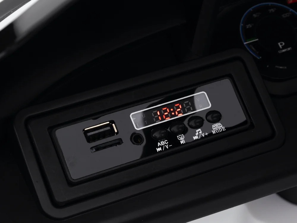 Мультимедиа: Помимо звука двигателя и USB MP3-вход. Полный контроль: В комплекте пульт 2.4 ГГц, позволяющий родителям управлять авто, изменять скорость или мгновенно остановить машину кнопкой паузы. Характеристики: Цвет: Белый (Глянцевая краска) Аккумулятор: 12 вольт 2 (по одному мотору на каждое заднее колесо)