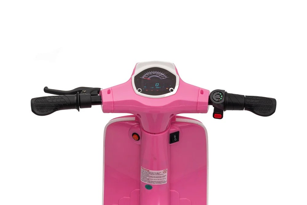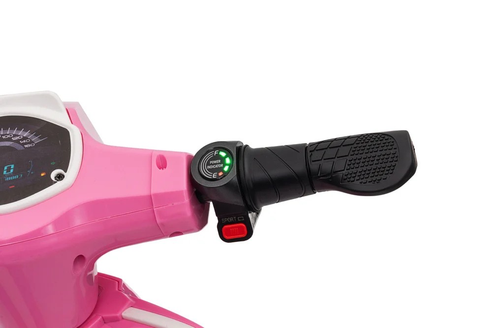 LED-фары улучшают видимость в темноте, а удобное сиденье из экокожи добавляет роскоши каждой поездке. Встроенный индикатор заряда всегда подскажет, когда придет время для подзарядки. Характеристики: Цвет: Розовый Аккумулятор: 24 вольт (2x 12V 10Ah последовательно соединены) Двигатель: 24 вольт вперед до 23 км в час, функция Soft Start