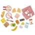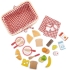 This picnic basket has everything you need for a picnic: juice, milk, fruits , cheese sandwich, croissant, two cups and plates, two toy knives, two forks, tablecloth, sweets.