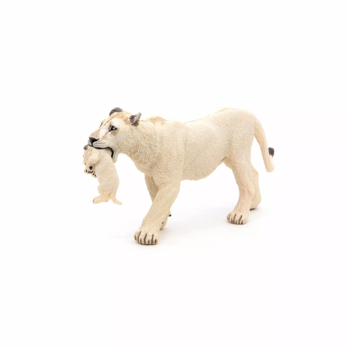 Elegant and strong, the white lioness is a rare inhabitant of the savannah, attracting attention with its bright fur and proud posture. Its appearance in the wild is a real rarity, because the coloring makes hunting difficult. That is why it can be found more often in nature reserves. In this figure, the lioness is not alone - she is holding a playful lion, which adds warmth and familiarity to the image.