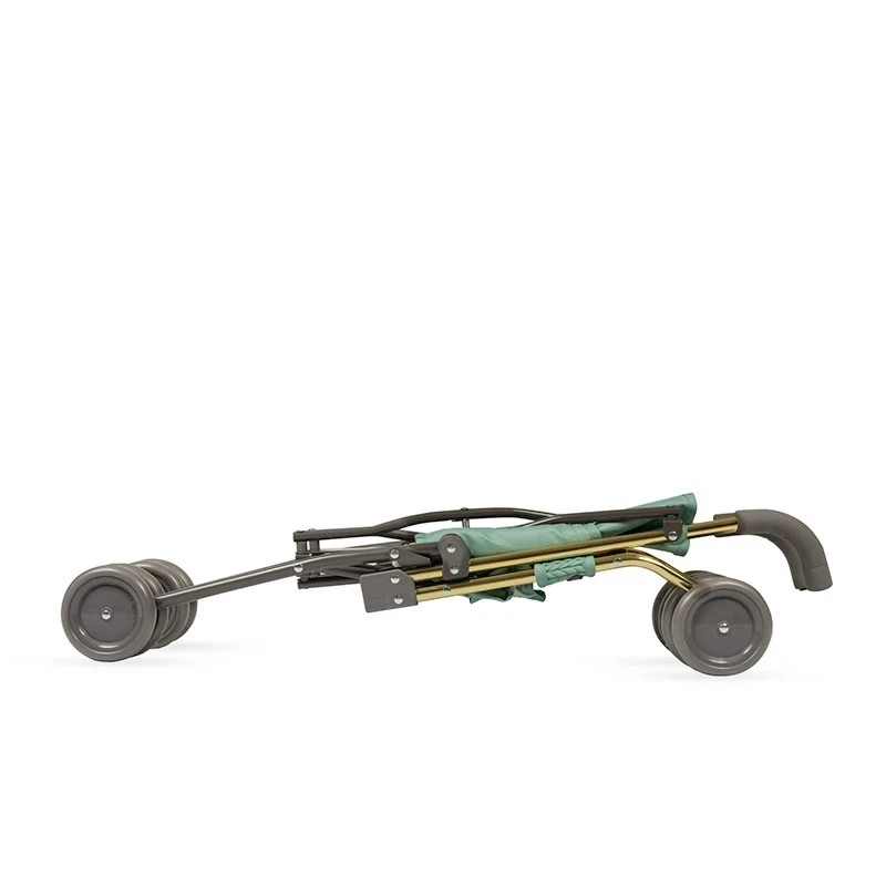 This stylish and compact toy stroller-cane from the Spanish brand DeCuevas Toys is designed for little fans of role-playing games. It is made in a delicate mint green color with an attractive woven fabric pattern and elegant golden details, which makes it look like the real thing.