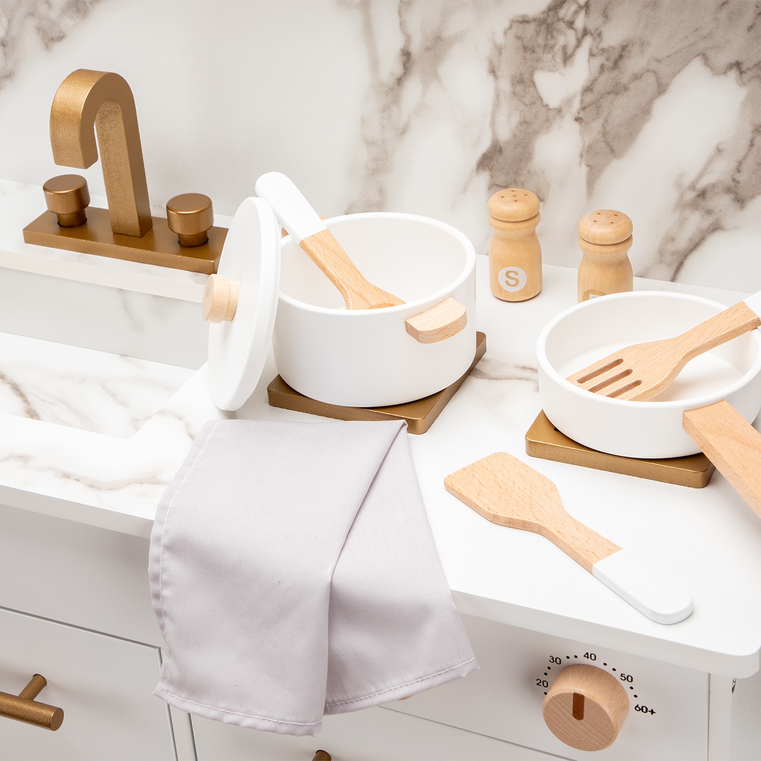 Развивайте воображение и кулинарные способности вашего ребенка с помощью этой деревянной мини-кухни от New Classic Toys. Этот игровой набор имеет изящный современный дизайн с мраморной столешницей и задней панелью, идеально подходит для маленьких шеф-поваров, любящих ролевые игры. Кухня оснащена реалистичными элементами: раковиной со смесителем золотого цвета, плитой с поворотными ручками и духовкой с прозрачной дверцей.