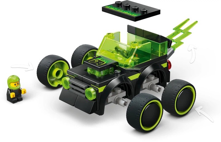 Это не просто автомобиль, а настоящий маслкар для фанатов видеоигр. Набор из серии Rides отличается футуристическим дизайном в стиле неон-гейминга. Яркие зеленые акценты, массивные колеса и минифигурка геймера делают этот конструктор идеальным подарком для современного ребенка, обожающего скорость и цифровую культуру.