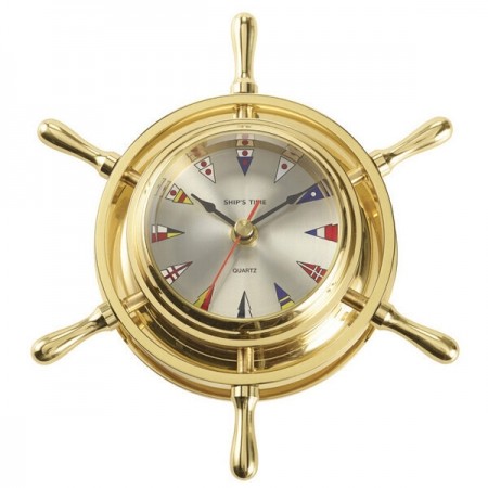 Морские часы в латунном корпусе в форме штурвала Эти морские часы — изящный аксессуар в морском стиле, сочетающий эстетику мореплавания с практичностью. Его циферблат украшают международные морские флаги – визуальные символы, которыми моряки общаются между собой уже столетиями. Такой элемент дизайна не только привлекает внимание, но и придает изделию уникальный характер. Корпус часов выполнен из латуни и имеет форму корабельного штурвала — классического символа навигации и управления. Благодаря этому форма идеально дополняет общий морской стиль изделия, делая его отличным выбором для декора кабинета, каюты, гостиной или офиса. Эти часы станут достойным подарком для ценителей морской тематики, капитанов, коллекционеров или просто людей с тонким вкусом. Материал корпуса: латунь Форма: штурвал Размеры: 21,0 × 21,0 × 0,0 см возраст: от 14 лет