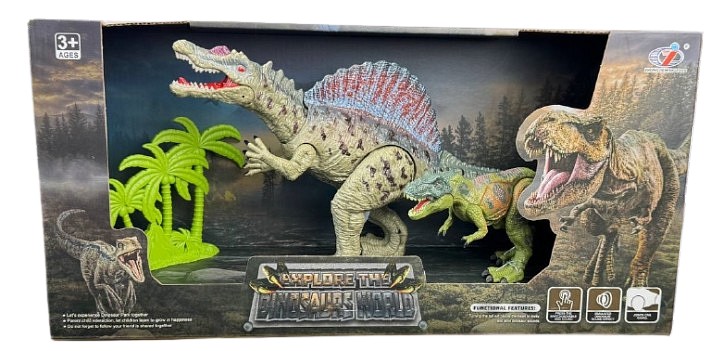 Игровой набор «Спинозавр и тираннозавр Рекс» со звуковыми эффектами подарит вашему ребёнку настоящие приключения в мире доисторических хищников. Реалистичные фигурки динозавров выполнены с вниманием к деталям — подвижные части тела и эффекты оживляют игру. При нажатии на лапу спинозавр издаёт грозное рычание, а его хвост, лапы, голова и челюсть двигаются, создавая ощущение настоящего сражения. При нажатии на кнопку на спинке тираннозавр двигает челюстью, демонстрируя свою мощь, а лапы тоже двигаются. Декорации в виде пальм добавляют атмосферы, помогая создать свой собственный мир динозавров и придумывать новые захватывающие истории. Набор упакован в красивую коробку с окошком, что делает его отличным подарком для маленьких поклонников доисторических существ.