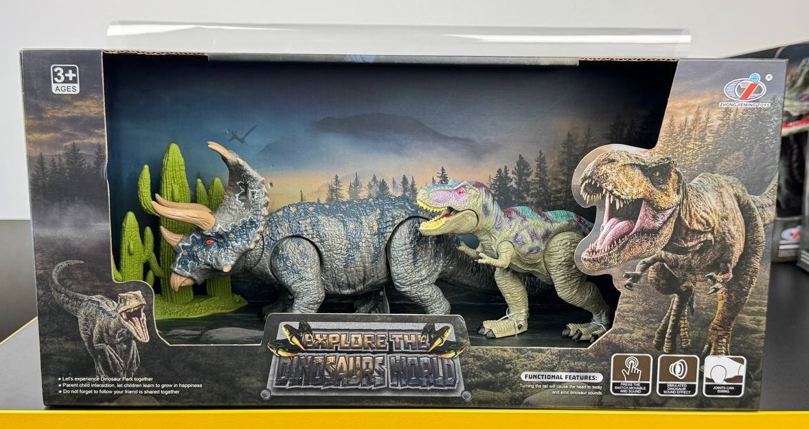 Трицератопс: 30 × 15 × 7 см, подвижные лапы, хвост, голова, звуковой эффект (рычание), питание от 3 батареек AG13
