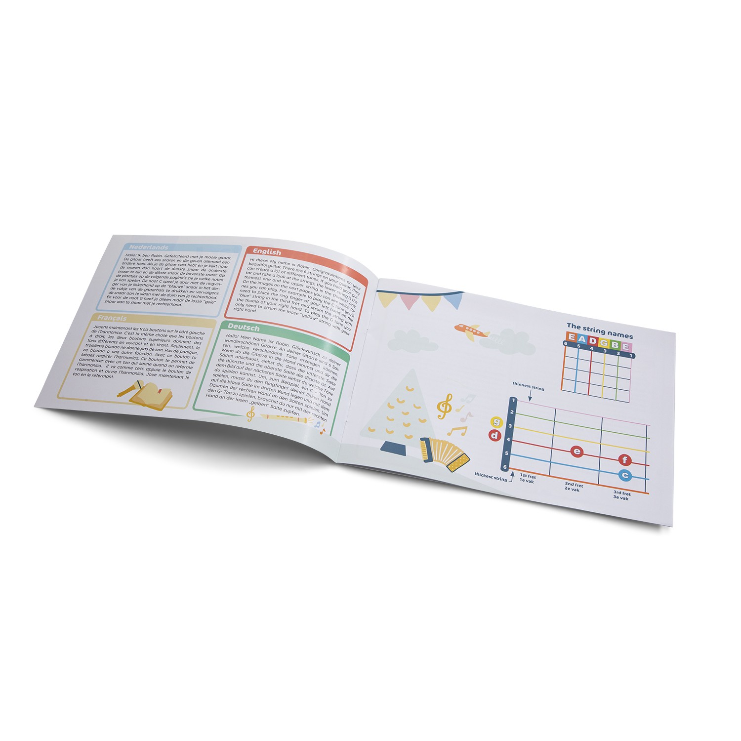 Гітара має шість нейлонових струн і звучить по-справжньому. У комплекті — кольоровий нотний зошит із трьома простими пісеньками, щоб одразу перейти до справи. Запасна струна та плечовий ремінець — як у справжніх гітаристів.