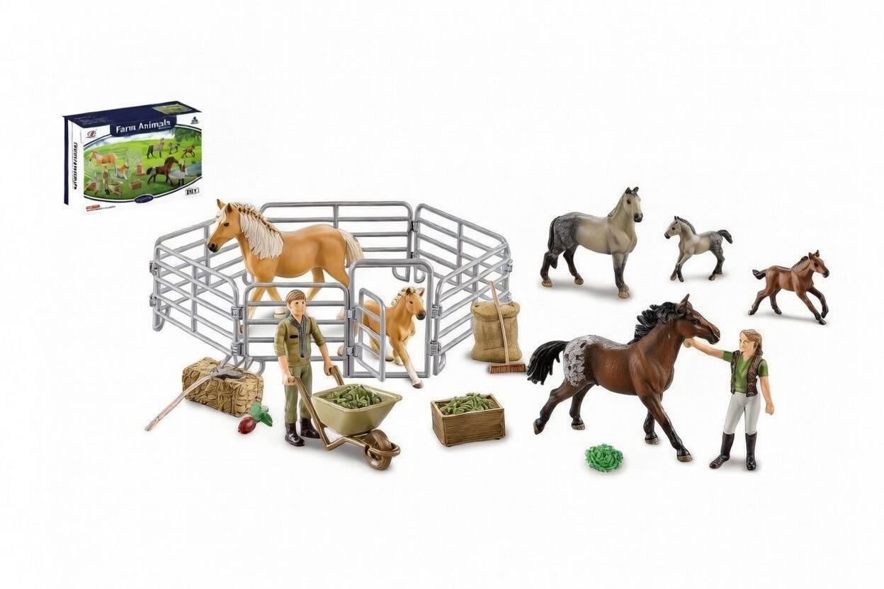 Створи власне ранчо мрії з цим яскравим ігровим набором! У коробці є все необхідне: кінь та лоша, огорожа, інвентар для годування та прибирання, їжа для коней і навіть фермер. Малюк зможе доглядати за тваринами, вигадувати цікаві історії та розвивати уяву. Обери улюблений набір або з’єднай кілька, щоб створити велике ранчо з різноманітними кіньми та пригодами.