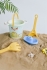 В набір входять: відро, лопатка, граблі, ситечко та пасочка (кораблик).