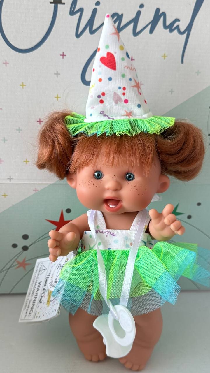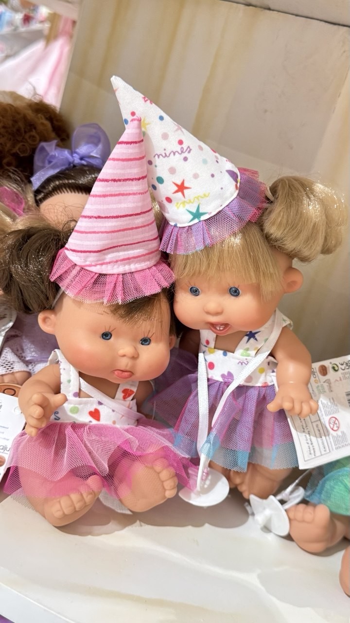 Пупси Nines d'Onil із серії Special Happy Birthday створені для веселощів та святкового настрою! Кожен пупсик одягнений у яскраву святкову сукню, має милу зачіску-хвостик і прикрашений святковим капелюшком, що робить гру ще більш чарівною. Кумедні вирази обличчя неодмінно викличуть усмішку у дітей і батьків. Тіло пупсика виготовлено з безпечного вінілового матеріалу без фталатів, тому його можна навіть купати. Соска на ланцюжку додає реалістичності та робить гру ще цікавішою. Оберіть свого улюбленого пупсика або зберіть всю святкову колекцію – вони стануть чудовим подарунком для будь-якого свята.